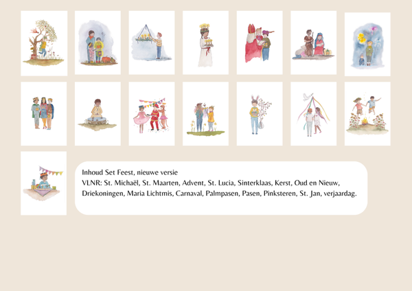 15 kaarten met bekende feestdagen zoals Kerst en Sinterklaas. Maar ook typische vrijeschool feesten als het michaëlsfeest en maria lichtmis.