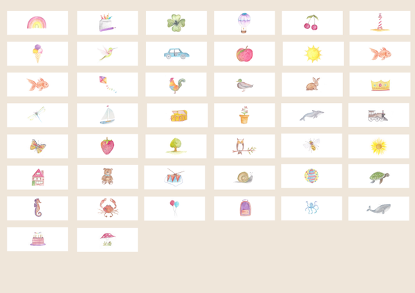 Een set van 44 kleine kaartjes kaartjes met vrolijke plaatjes. Leuk bij een klein cadeautje of bosje bloemen.