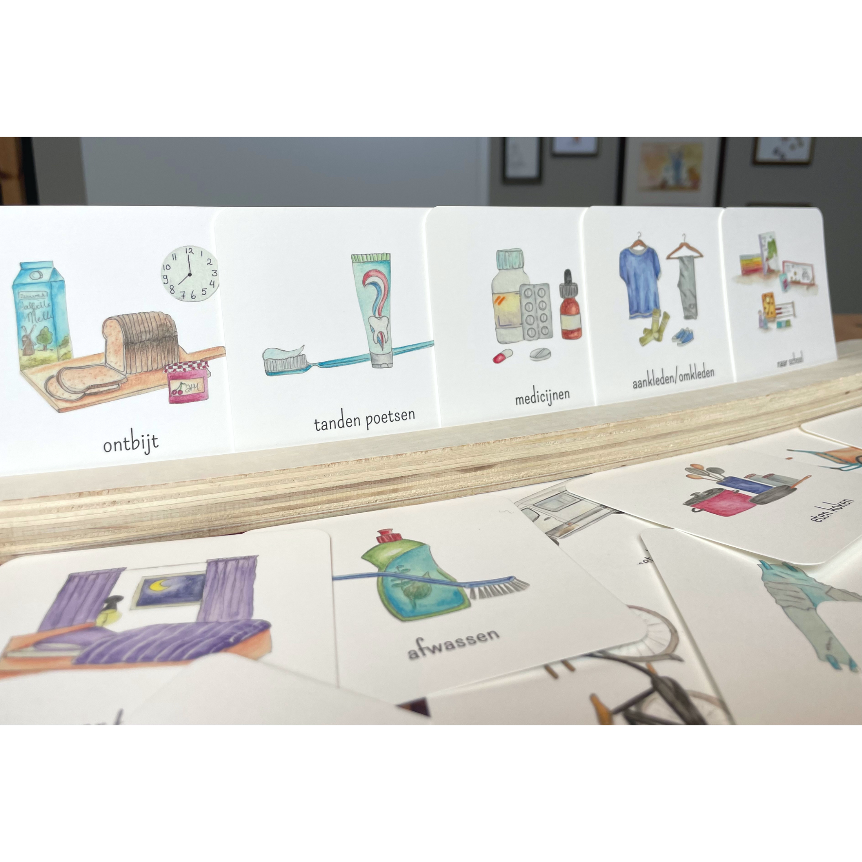 Met deze set breng je (een deel van) de dag overzichtelijk in beeld, dit zorgt voor visuele ondersteuning en het kind om zelfstandiger de handelingen uit te voeren.