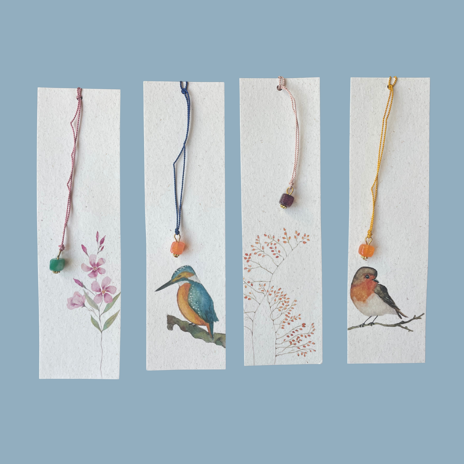 Deze boekeleggers zijn gedrukt op papier gemaakt van Olifantgras. Hierdoor zijn ze duurzaam én heel mooi. Aan de boekenlegger hangt een edelsteentje passend bij de kleur van de afbeelding.