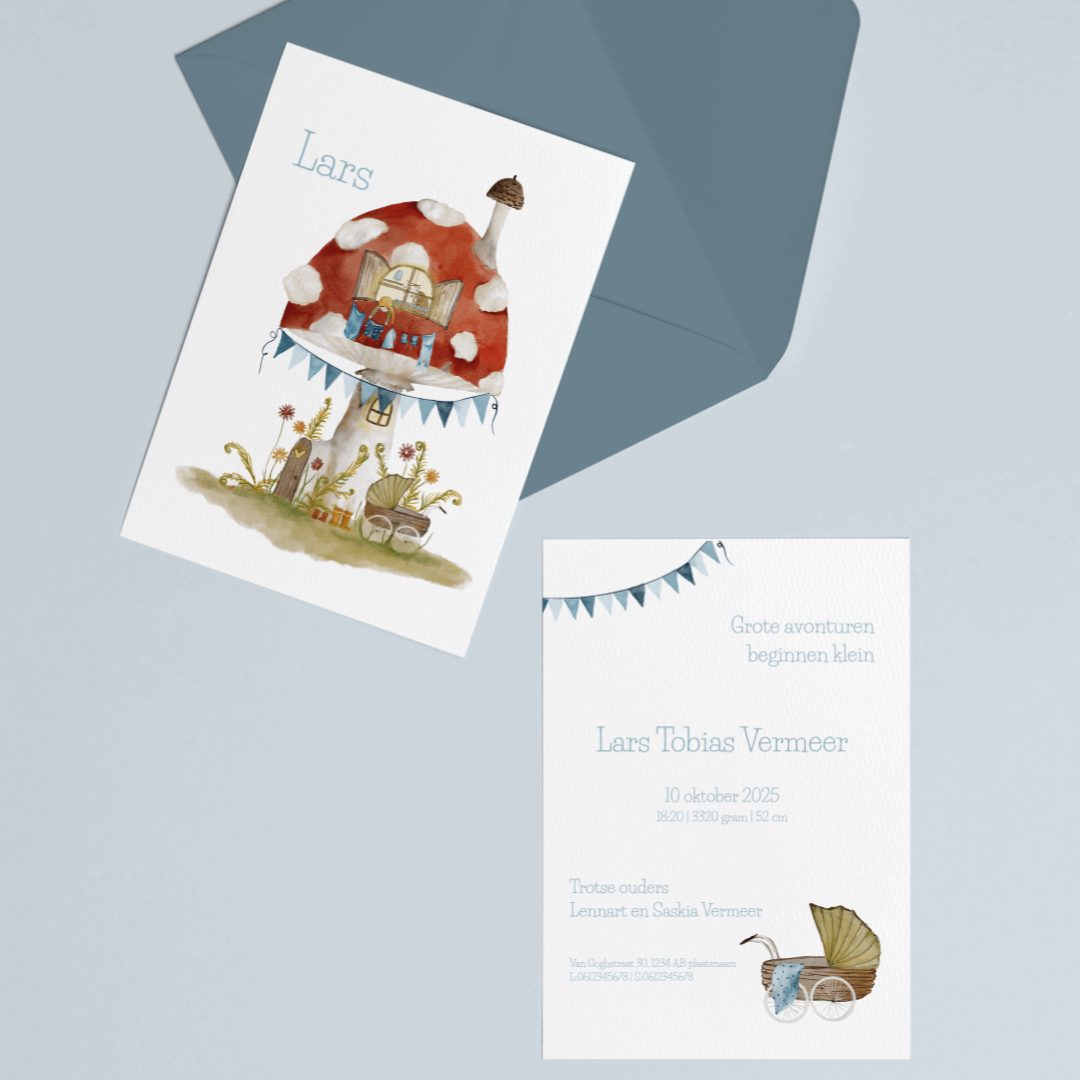 Sprookjesachtig geboortekaartje met een gezellig paddenstoelenhuisje, vrolijke vlaggetjes en zachte aquareltinten. Ideaal voor een dromerige en unieke aankondiging van jullie kleintje.